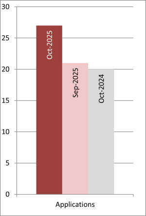 This graph of patent filing volumes applied for by New Zealanders shows that the number of complete patent applications applied for was 27 in the month of October, up from 21 in the month earlier, compared with 20 in the same month in last year.