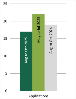 This graph of plant variety rights filing volumes shows that the number applied for was 17 in the period of three months to October, down from 22 in the three months prior to that, compared with 19 in the same three month period last year.